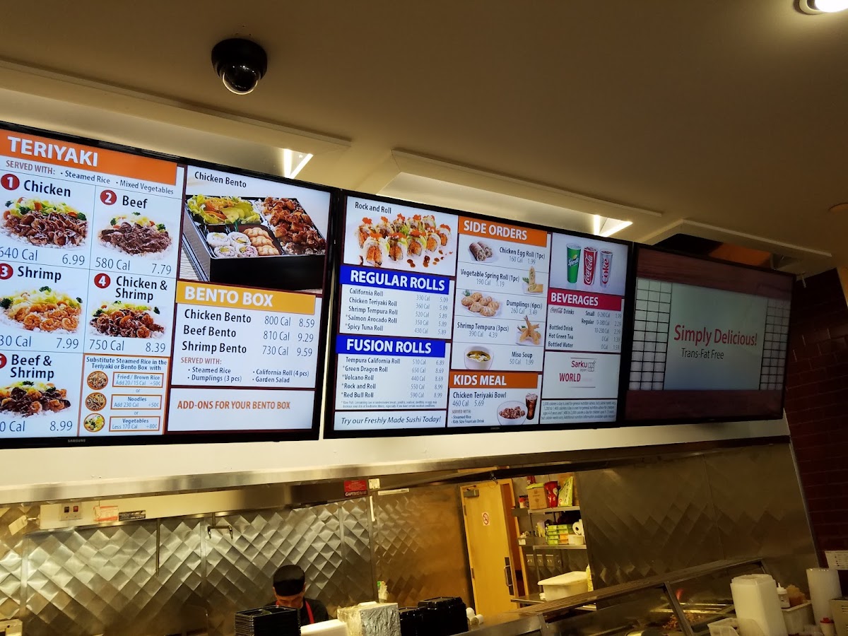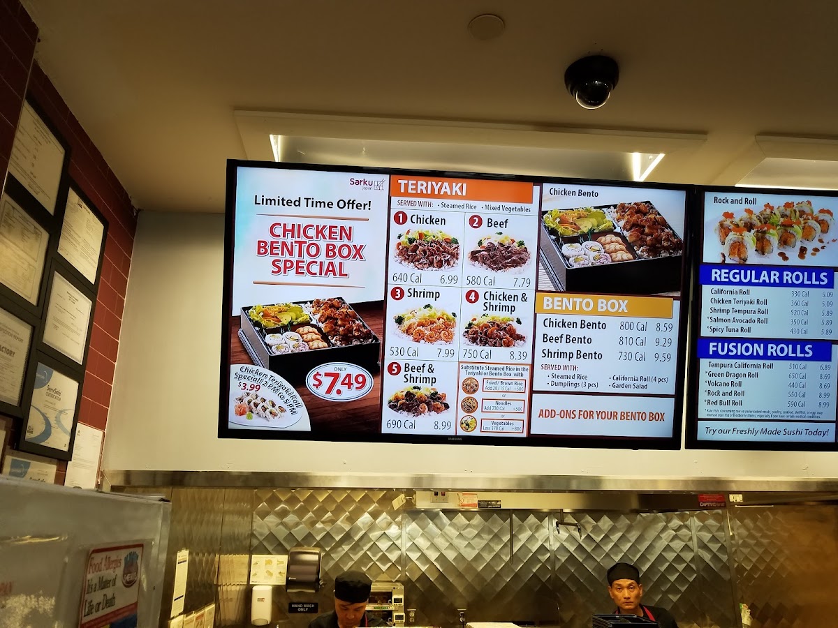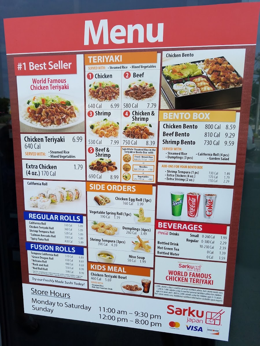 From a reviewer’s perspective, the menu at Sarku Japan Teriyaki & Sushi Express offers a straightforward yet satisfying selection centered on classic Japanese-American favorites. The teriyaki lineup is the highlight, featuring options like CHICKEN TERIYAKI, BEEF TERIYAKI, SHRIMP TERIYAKI, and combination plates such as CHICKEN & SHRIMP TERIYAKI and BEEF & SHRIMP TERIYAKI, all delivering the expected savory, grilled flavors. For those looking for a more complete meal, the CHICKEN TERIYAKI COMBO, BEEF TERIYAKI COMBO, and SHRIMP TERIYAKI COMBO provide hearty portions, while the CHICKEN & SHRIMP TERIYAKI COMBO and BEEF & SHRIMP TERIYAKI COMBO add variety. The BENTO options-CHICKEN BENTO, BEEF BENTO, and SHRIMP BENTO-offer a balanced assortment for diners wanting a bit of everything. Starters like SHRIMP TEMPURA, DUMPLINGS (6pcs), CHICKEN EGG ROLL, and SPRING ROLL (2PCS) complement the mains well, with WHITE SAUCE as a popular addition. Sushi lovers can try the VOLCANO ROLL, adding a fusion twist to the menu. To round out the meal, beverages such as SNAPPLE LEMON TEA, SNAPPLE KIWI STRAWBERRY, CANNED COKE, CANNED DIET COKE, and CANNED SPRITE provide familiar refreshment options. Overall, while pricing isn’t specified, the menu emphasizes variety and classic flavors, making it a reliable choice for a quick and filling meal.