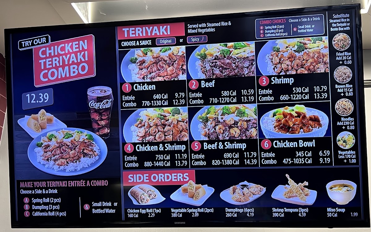 Comes with steamed white rice, garden salad, California Rolls (4), Dumplings (3). Noodles, fried rice, brown rice are available for an additional cost. 730 Calories-890 Calories.
