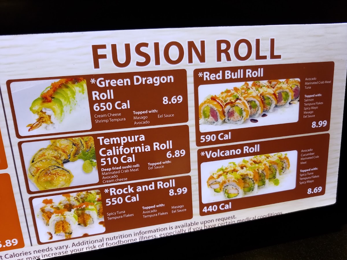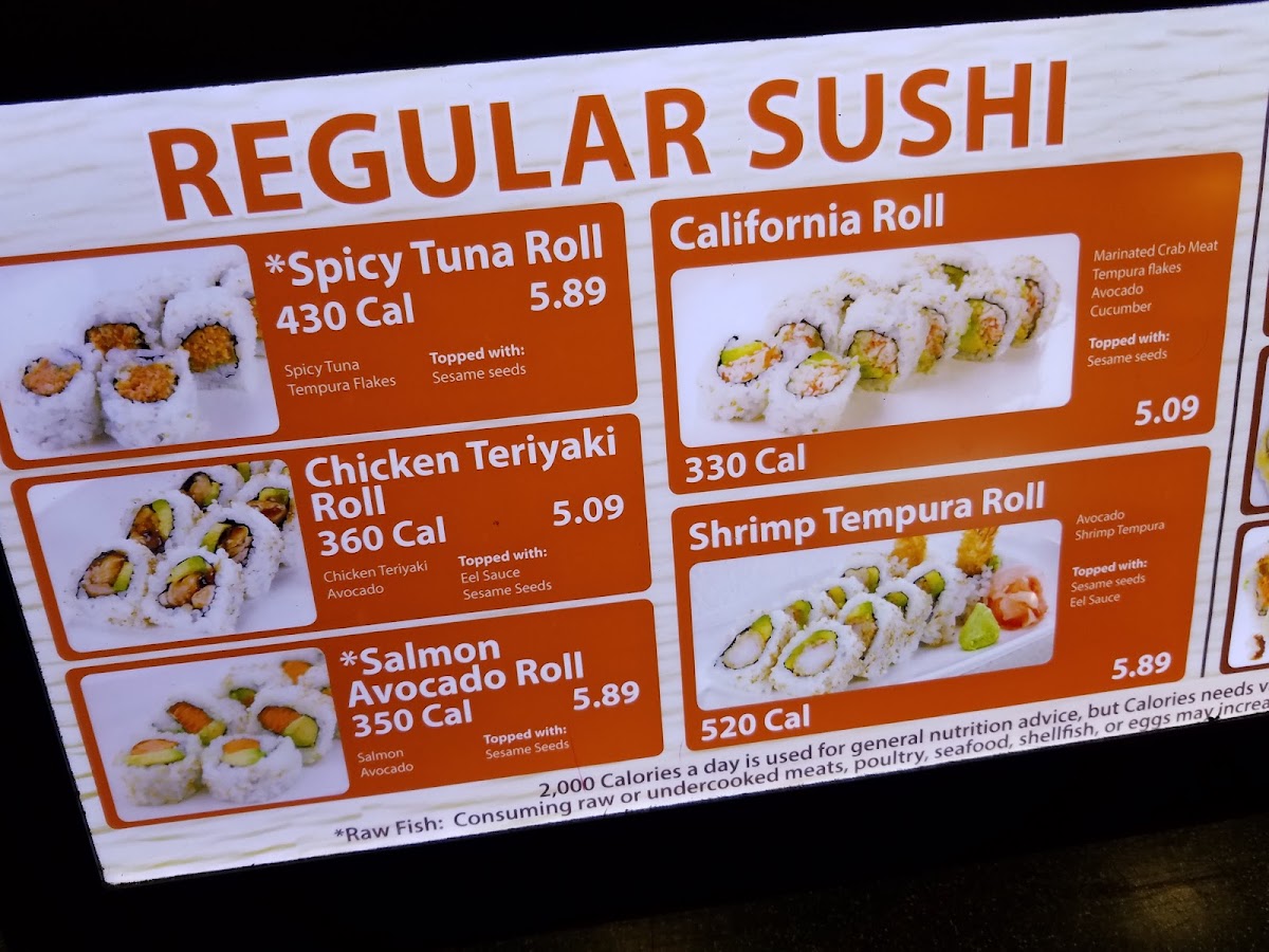 Spicy tuna on top of California roll with spicy mayo, scallion and crunchy flakes on top. 440 Cal.